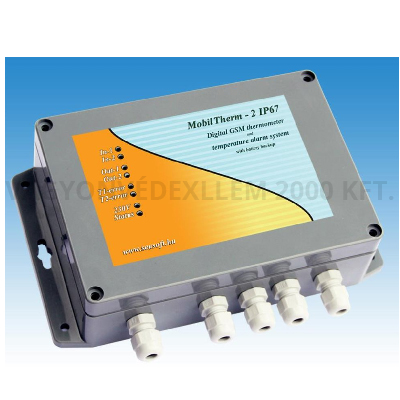 A MobilTherm-2-IP67 távmérésre, távjelzésre és távműködtetésre kifejlesztett ipari GSM alapú, ipari nagyáramú távhőmérő, hőfokjelző és hőfokriasztó modul IP67-es dobozba szerelt kivitelben. A készülékben hálózati tápegység is van, táplálása 230V-ról megy. A GSM modulnak belső Lythium-polimerakkumulátora, 2 db10 mes külső digitális hőmérője, 2 db záró kontaktusra aktiv bemenete és 2 db nagyfeszültségű és nagyáramú, 230V 8A-es relés kimenete van. Relés kimenetei SMS-ekkel kapcsoltathatók bistabil (csak újabb SMS-re változó) állapotba, vagy monostabil állapotba, azaz egy parancs SMS hatására adott időre meghúzattatható, mely idő letelte után ez a relé automatikusan kikapcsol. A modulhoz csatlakoztatott 2 db digitális hőmérő -50C és +50C fok között mér. A beállított alsó-felső hőmérsékleti határokat átlépve a felprogramozott telefonszámokra értesítést küld. A bemenetek változásairól is küld SMS-t. A felhasználók a hőmérsékleti riasztásról és a bemenet változásokról beállított tartalmú SMS-ben és/vagy telefonhívással értesülnek. A relék No, Nc és Com kimenetei vannak kivezetve, így a fogyasztók alapállapotban lehetnek be-, vagy kikapcsoltak is, és a relé meghúzásával változtathatók.: A MobilTherm-2-IP67 GSM távhőmérő 4 telefonszámra programozható fel. Vízálló és páratűrő doboza miatt fóliaházak, üvegházak, hűtőkamrák, állattelepek és szabadtéri elhelyezésre javasolt is, de poros és/vagy erősen szennyezett környezetben is jól használható, mint például temperált mezőgazdasági és/vagy állattenyésztési célokra szolgáló telepeken és épületekben is. Tápfeszültség igénye 230V hálózati feszültség min. 100mA terhelhetőséggel. A modul felprogramozása az erre a célra szolgáló ingyenes ''Unified'' letöltő szoftverünkkel számítógépről USB porton keresztül, vagy a modulra küldött néhány SMS által lehetséges.