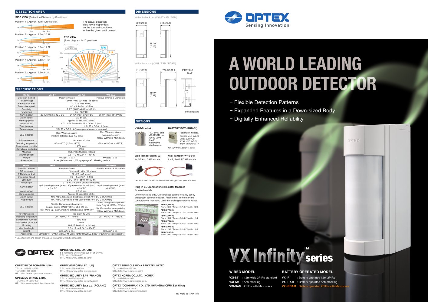 Passzív infra mozgásérzékelő kültérre (IP55). Két PIR, 12m érzékelési távolság 90°-ban (+7°). SMDA logika, hőmérséklet kompenzáció. Választható NO/NC riasztás kimenet. Az érzékelő házon belül 180°-ban forgatható. Érzékenység állítás, szürkületi kapcsoló. Telepítési magasság 0.7-1.2m